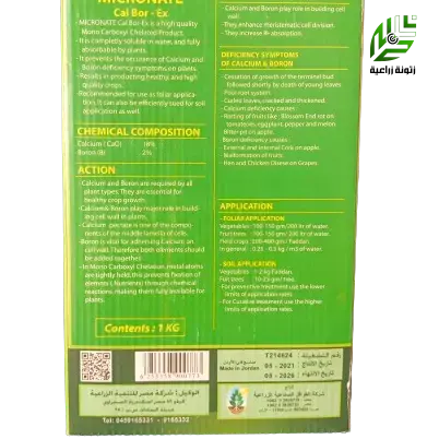 - يستخدم لزيادة العقد و الثمار و تقليل تساقطها . - يعمل علي زيادة حيوية حبوب اللقاح و اكمال نموها لتحسين عملية الاخصاب. - يساعد في تنظيم عملية انقسام الخلايا و تمام عملية التلقيح و الاخصاب للنبات . - يعمل علي انتاج ثمار متماثلة و تقليل تشوه الثمار . - يعمل على الوقاية من الأمراض الفسيولوجية الناتجه عن نقص الكالسيوم مثل عفن الطرف الزهري . - تركيبة سمادية بعنصر الكالسيوم و البورون الضروريان للنبات . - تحقق افادة عالية للنباتات تتمثل فيما يلي :1- التقليل نت تنفيل الازهار وتسلقط الثمار . 2 - تحسين نوعية الثمار و زيادة قابليتها للتخزين . - يدخا الكالسيوم في بناء الجدار الخلوي للنباتات ؛اما البورونفيقوم بتثبيت الكالسيوم علي جدار الخلية من هنا برزت اهمية الكالسيوم و البورون كوحده واحدة - يؤدي استخدام هذه التركيبة الي ما يلي :-1- الوقاية من اعراض تعفن مؤخرة الثمار Blossom End ROT في العديد من المحاصيل الخضراوات مثل البندورة و الباذنجان و الفلفل و البطيخ . الناتجة عن نقص عنصر الكالسيوم . 2- وقاية قمار التفاح من التبقعات Bitter Pit الناتجة عن نقص عنصر الكالسيوم . 3- وقايةثمار التفاح من تكون الطبقة الفلينية البنية ( Cork ) الداخلية و الخارجية الناتجة عن نقص عنصر البورون . 4- وقاية العنب من ظاهرة و هي تكون حبات كبيرة و اخر صغيرة جدا علي العنقود .